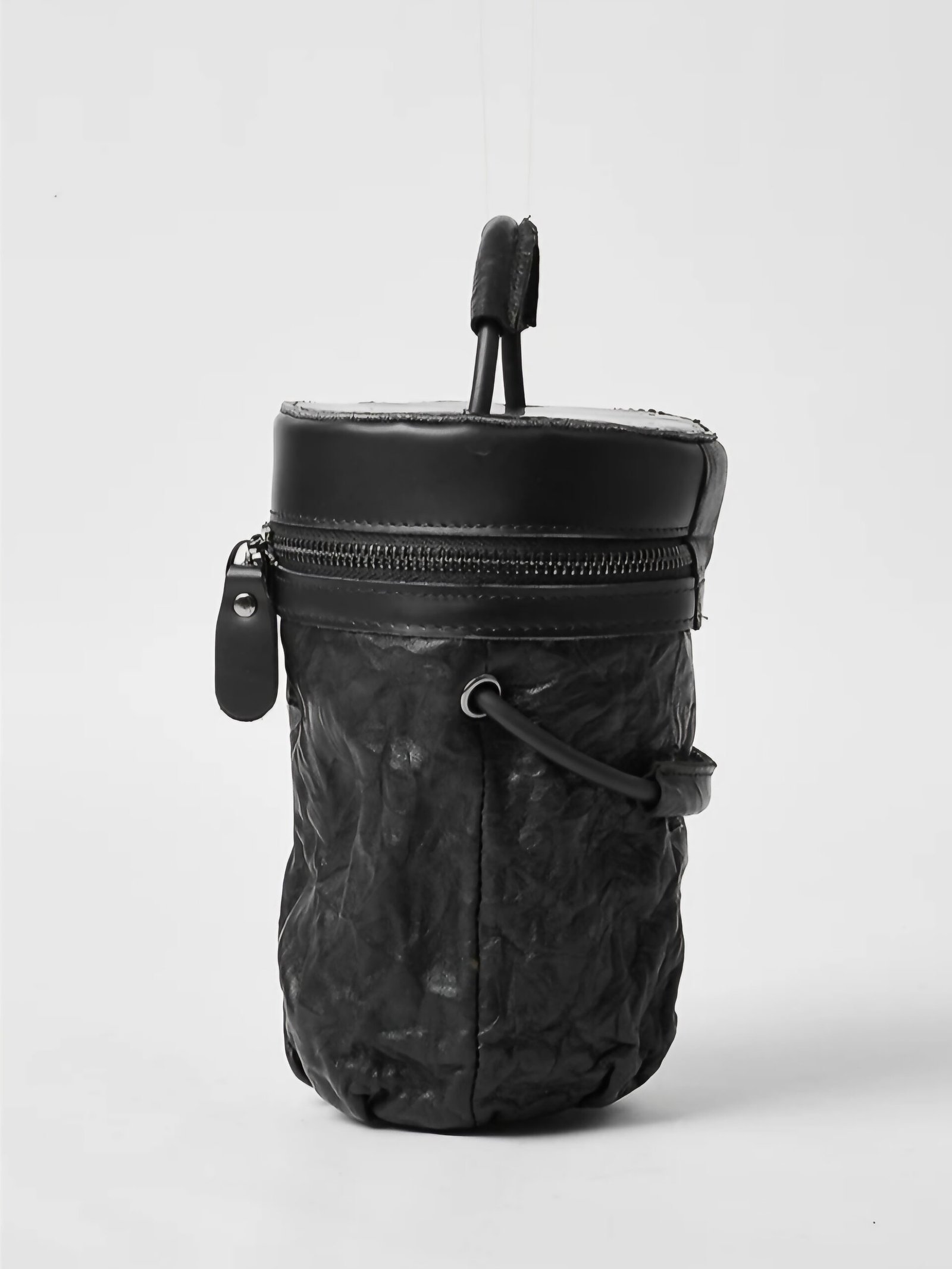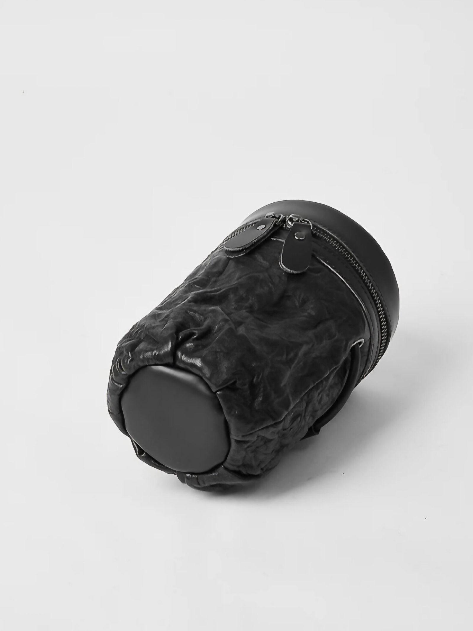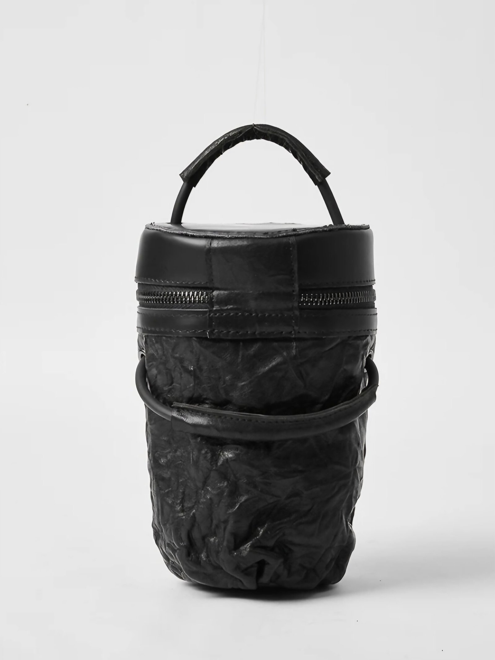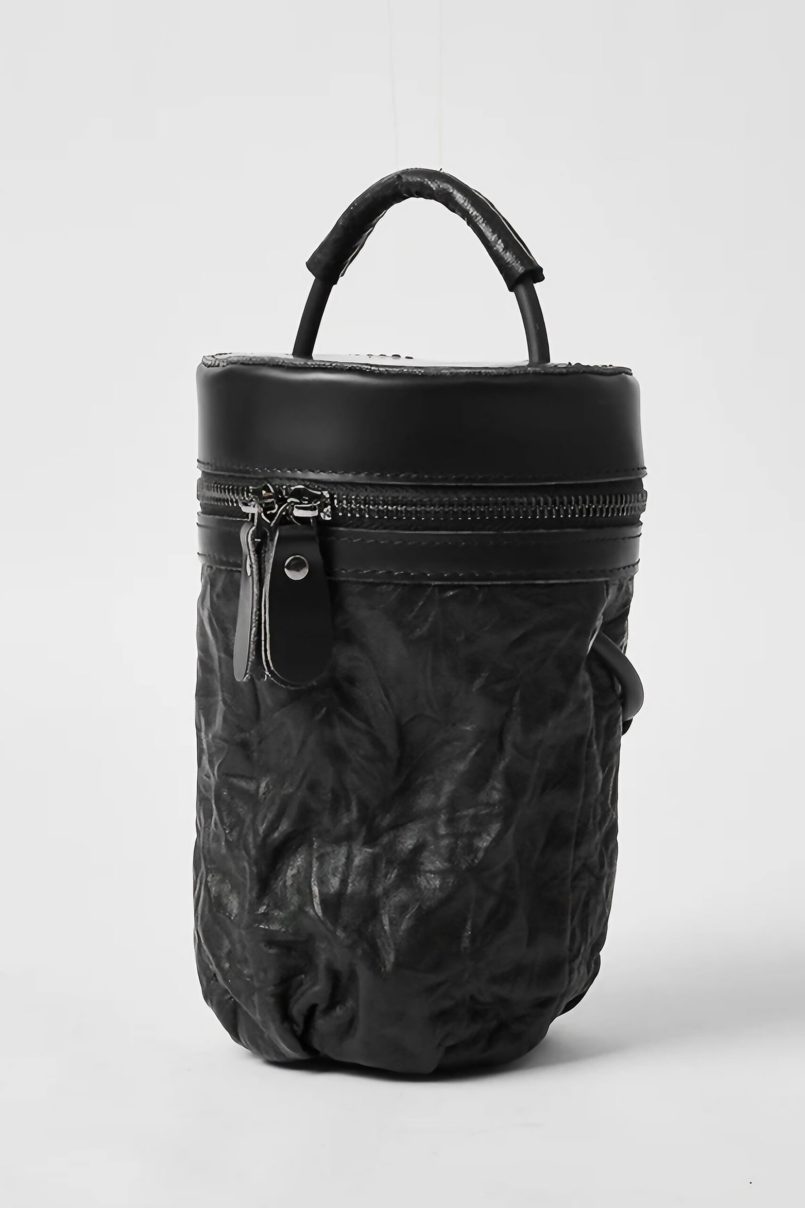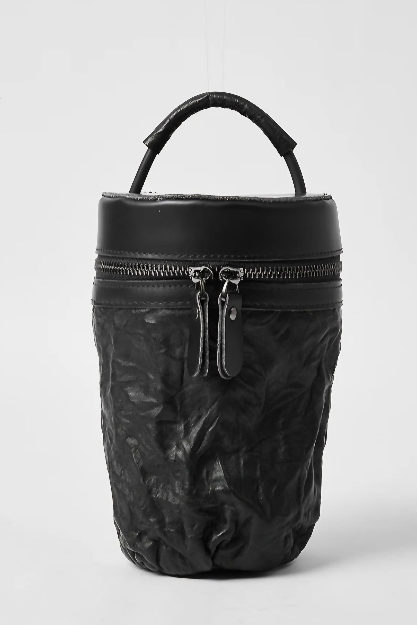 A bold reinterpretation of modern minimalism, this structured mini bag is crafted from premium cow leather with a unique cylindrical silhouette. The crinkled texture adds depth and character, while the dual-zip closure and top handle ensure both form and function. Compact yet impactful, it’s the perfect statement piece for those who appreciate sculptural design with utility.