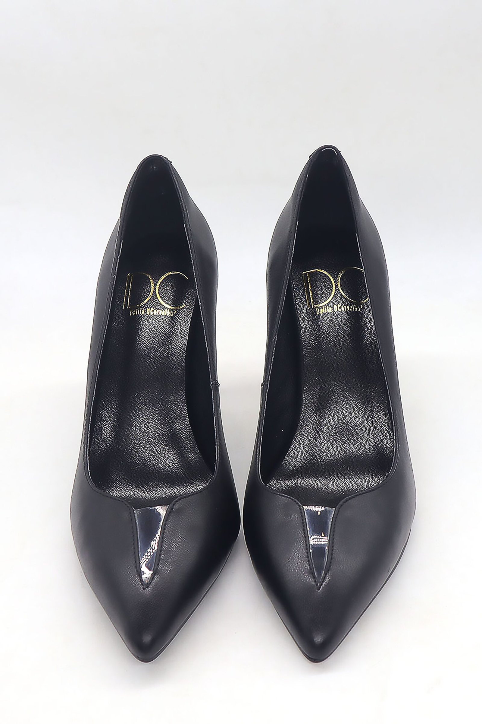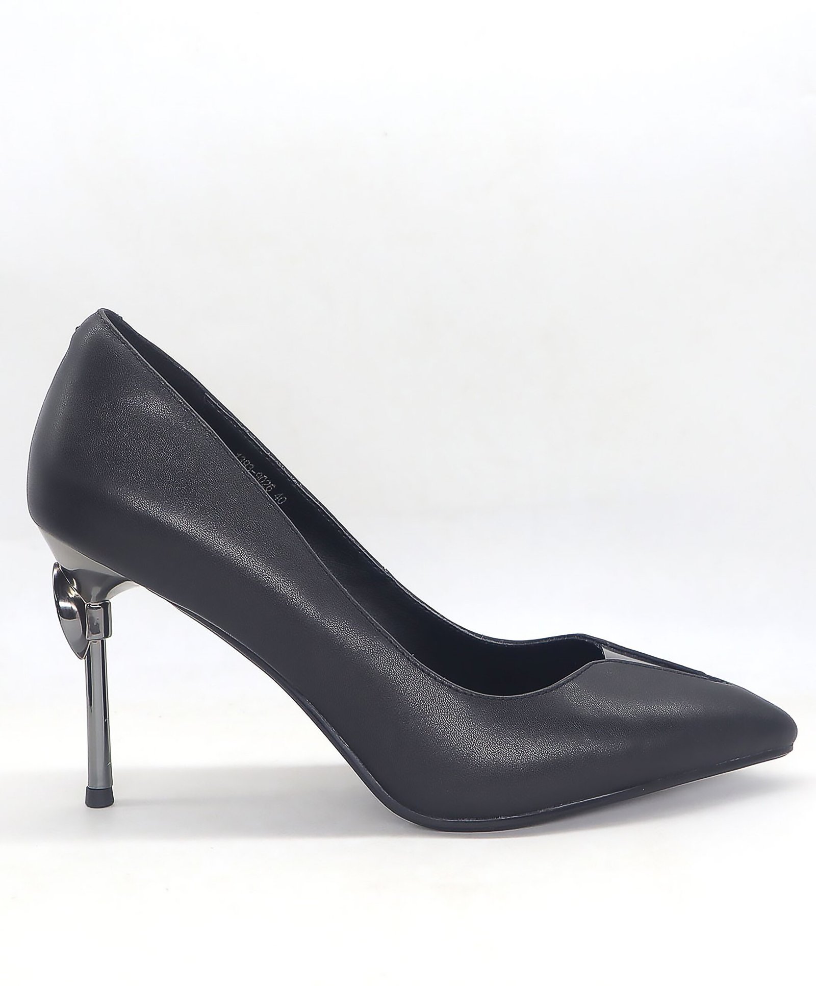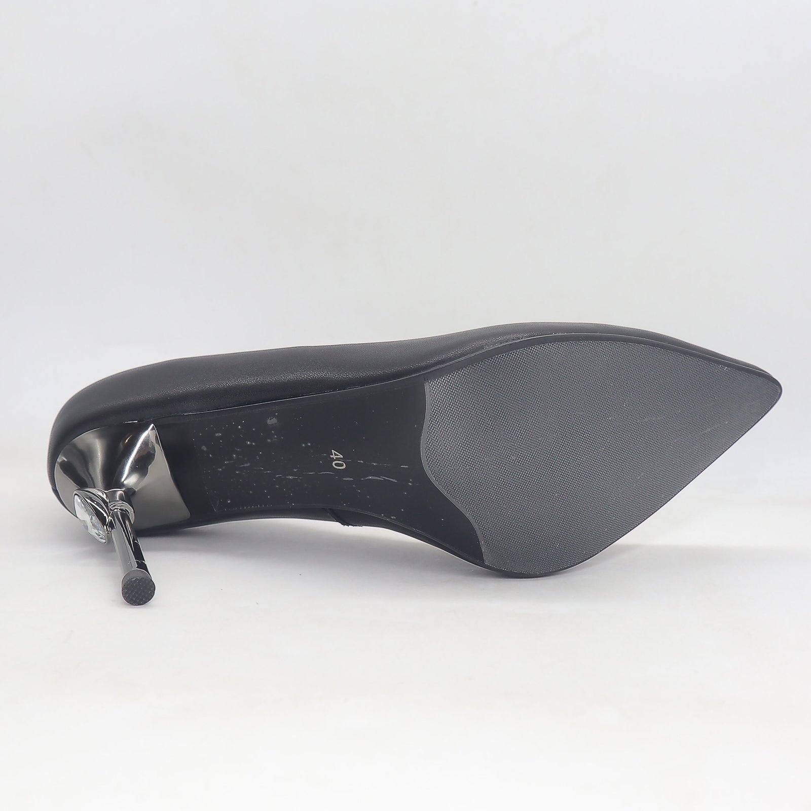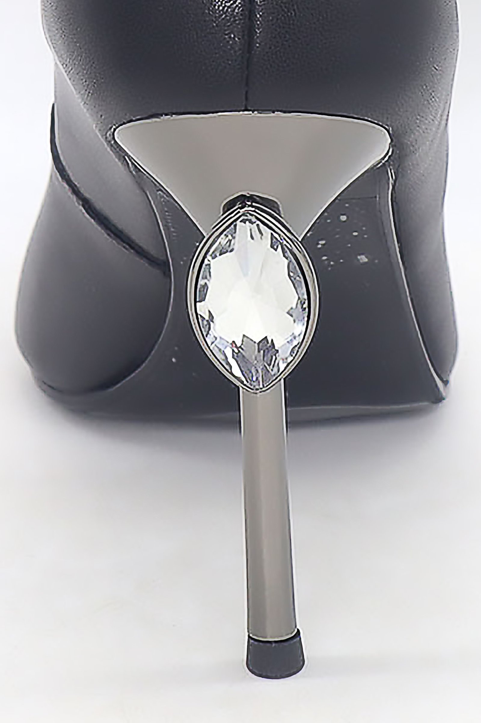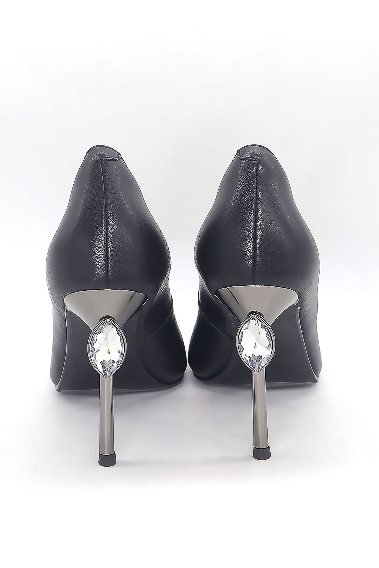 Sophisticated from every angle, this all-black leather stiletto is elevated by a silver sculptural heel embellishment and minimalist vamp cutout. A refined yet dramatic design made to stand out in silence.
