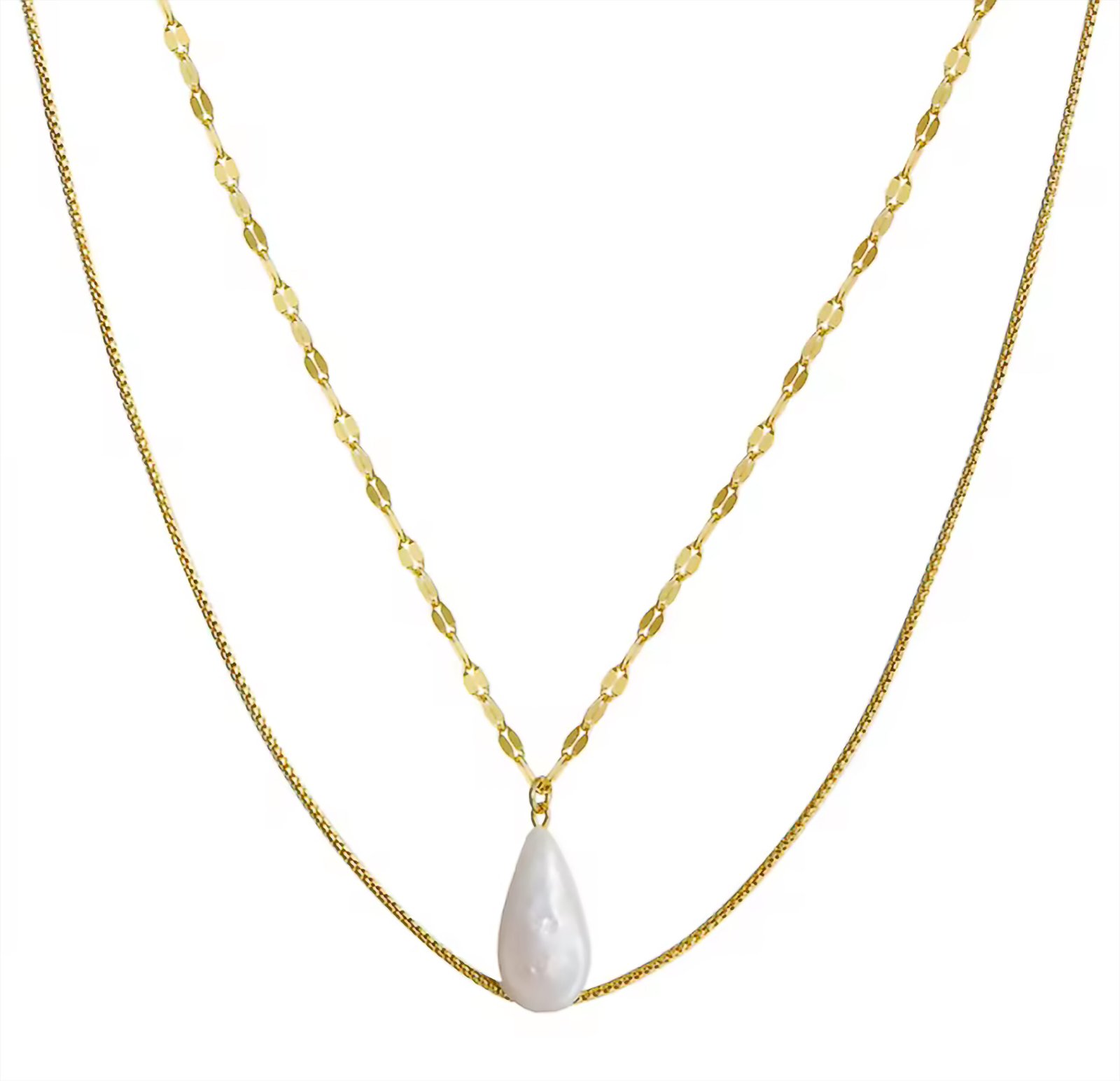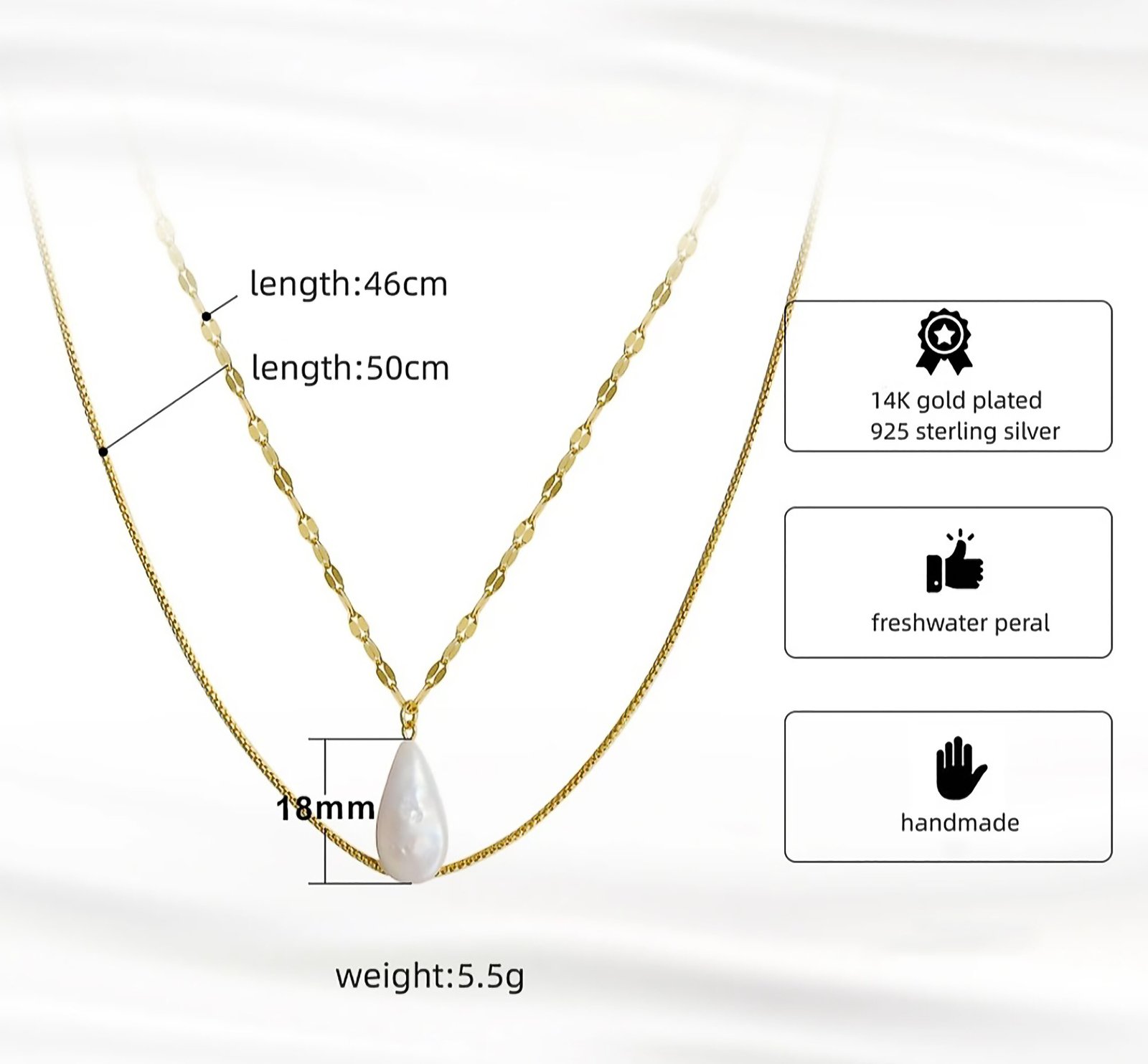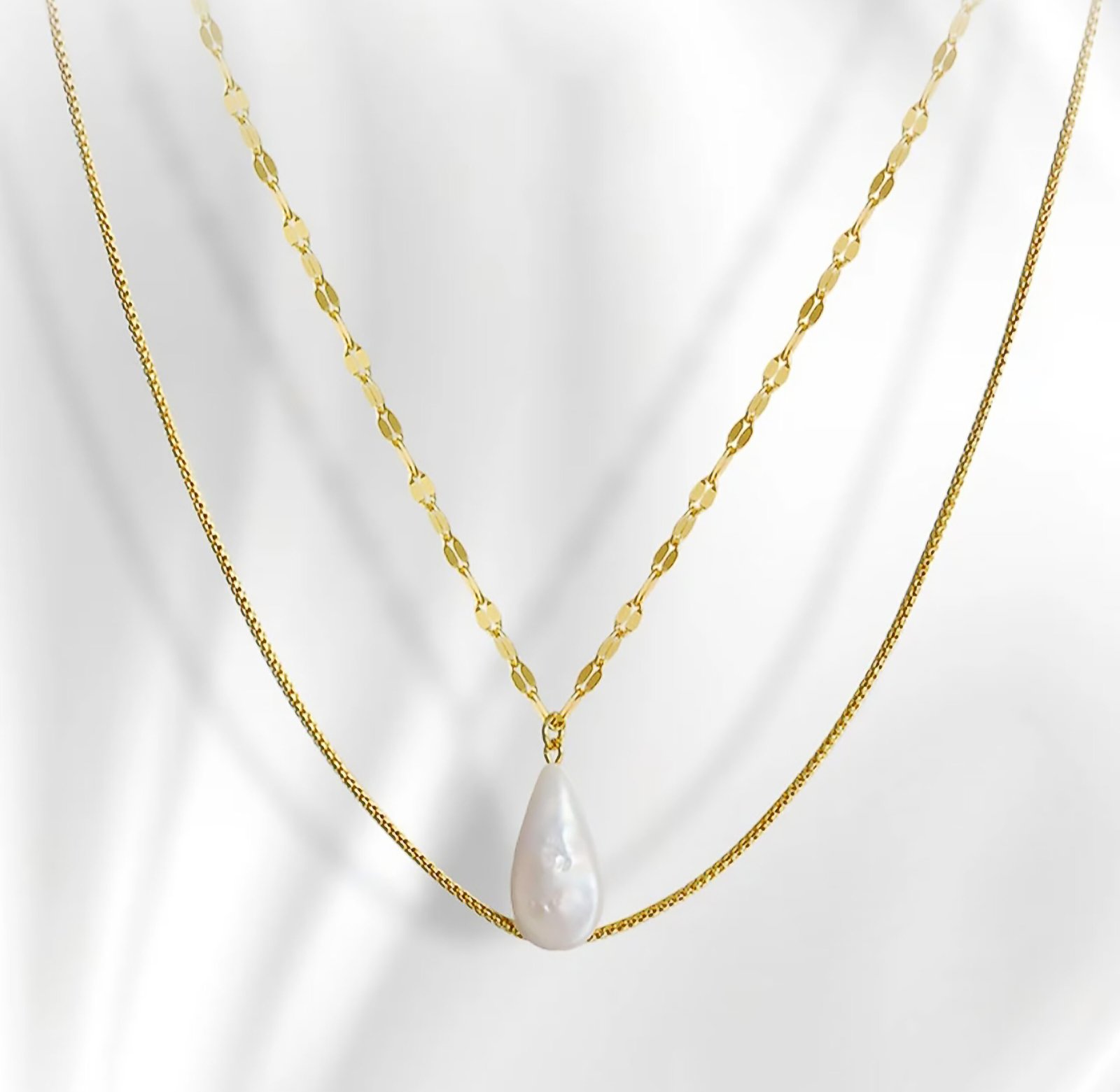 Design: Dual-chain necklace with varying textures and a teardrop pendant